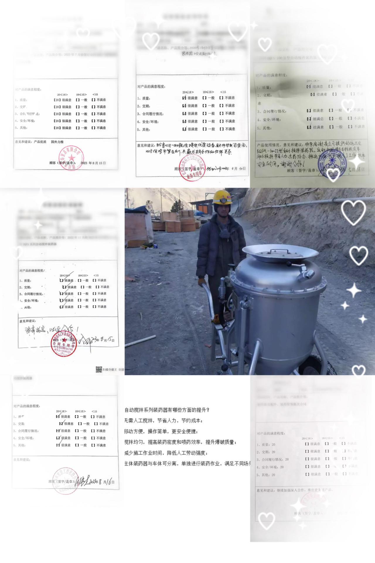BQFA型自動(dòng)攪拌系列裝藥器,與人工攪拌相比,無(wú)需人工攪拌,節(jié)省人力且攪拌均勻,移動(dòng)方便,操作簡(jiǎn)單便捷,大大降低人工勞動(dòng)強(qiáng)度,提高裝藥密度、爆破質(zhì)量,減少施工作業(yè)時(shí)間。先后出口塔吉克斯坦、老撾,秘魯,尼日利亞、法國(guó)等國(guó)家,使用情況反饋中得到一致好評(píng)并大力推薦。